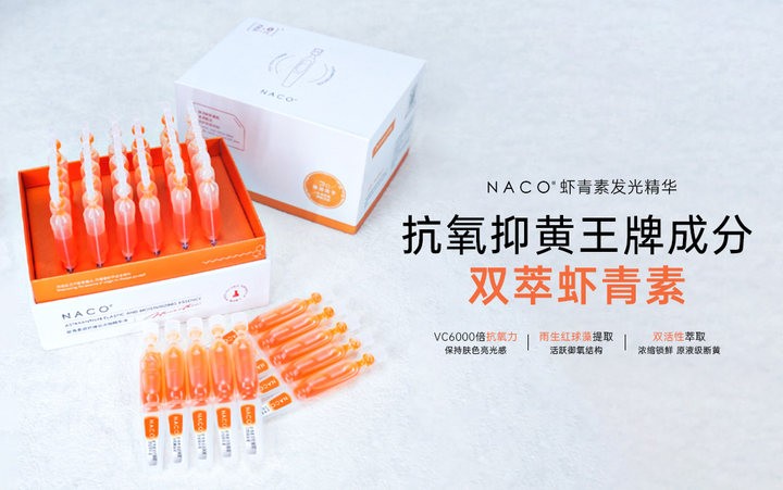 NACO虾青素是国货护肤品新锐品牌NACO主打成分,诞生于2018年,NACO虾青素持续4年斩获多平台虾青素“爆款榜”TOP1的傲人成绩,以黑马之姿成为各大平台力推的宝藏发光品牌。2018年初代NACO虾青素上市,月销突破1262w支,2019年NACO虾青素、烟酰胺冲TOP1,全渠道月销超过3062w支,到2021年NACO虾青素霸榜抖音,单品月销2600w支。2022年NACO虾青素破圈升级,全新配方&次抛包装功效翻倍,霸榜抖音抗氧榜单销量NO.1。