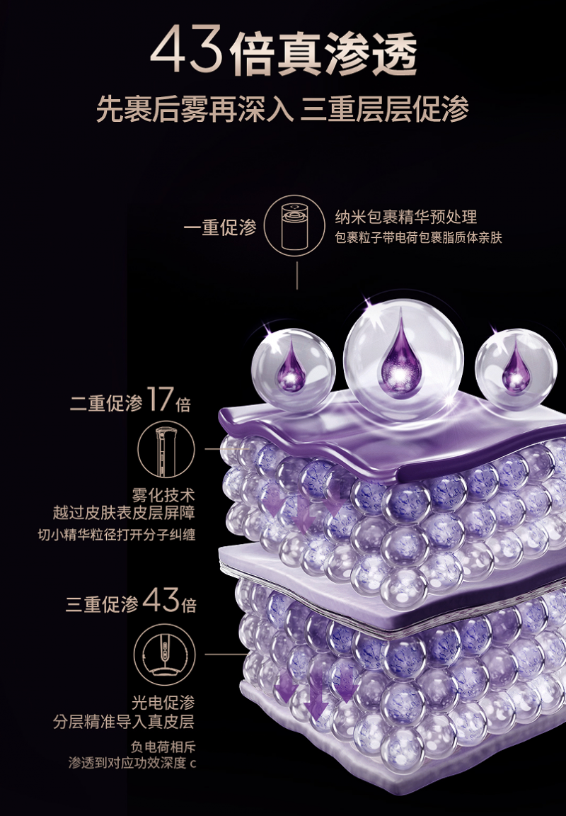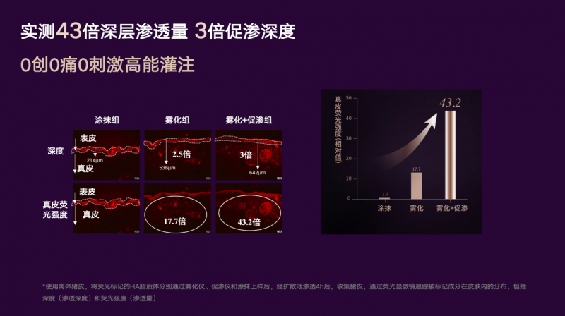 实验表明,相较于手涂精华方式,通过岚至专利纳米包裹精华及核心射流雾渗技术先行递送精华,再借助雾光精华仪B(能量球)双频E-Power分层电脉冲技术的促渗加持下,可实现护肤精华的43倍渗透量、3倍促渗深度提升,还可设定不同光电参数协同渗透到对应功效深度,实现护肤精华0创0痛0刺激的“高能”灌注。