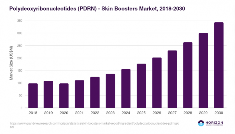 根据Horizon Databook数据,2024年全球PDRN市场规模已达15.57亿美元,预计2030年将达到34.27亿美元,年复合增长率14.1%。目前已有近4000个品牌、1.6万余款产品将PDRN应用于护肤与医美领域。