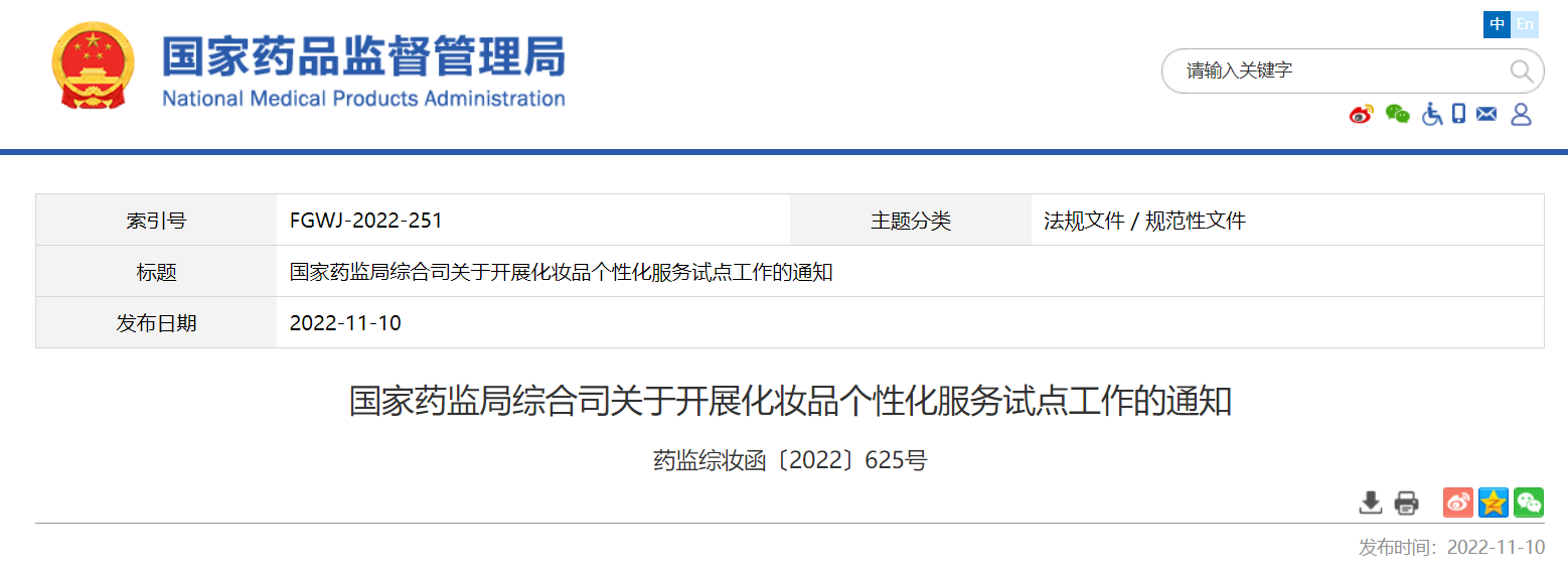 《国家药监局综合司关于开展化妆品个性化服务试点工作的通知》截图