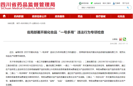 7月13日,四川省药品监督管理局开展“一号多用”违法行为专项检查,集中排查治理通过在产品标签上违法标注化妆品注册备案资料以外的文字、商标、标识或者以其他方式套用特殊化妆品注册证编号或者普通化妆品备案编号的行为。