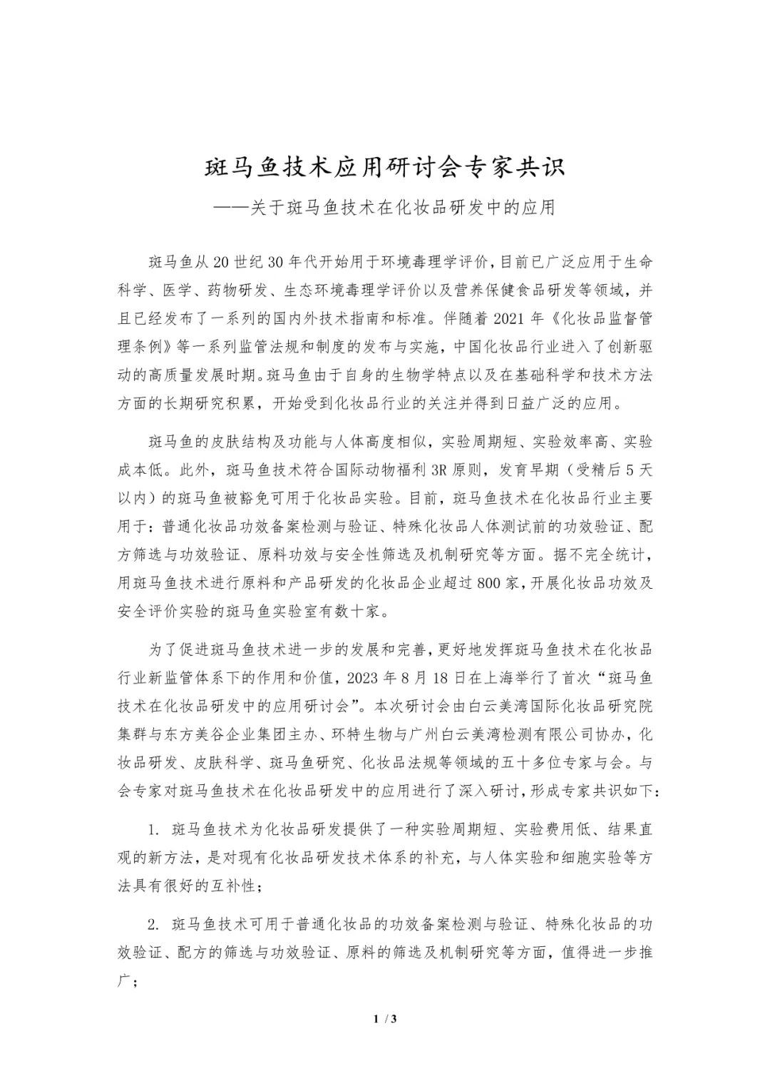 为了促进斑马鱼技术进一步的发展和完善,更好地发挥斑马鱼技术在化妆品行业新监管体系下的作用和价值,2023年8月18日在上海举行了首次“斑马鱼技术在化妆品研发中的应用研讨会”。本次研讨会由白云美湾国际研究院集群、东方美谷集团主办,环特生物与广州白云美湾检测有限公司协办,化妆品研发、皮肤科学、斑马鱼研究、化妆品法规等领域的50多位专家与会,对斑马鱼技术在化妆品研发中的应用进行了深入研讨,形成5项专家共识,供斑马鱼技术应用实践参考——