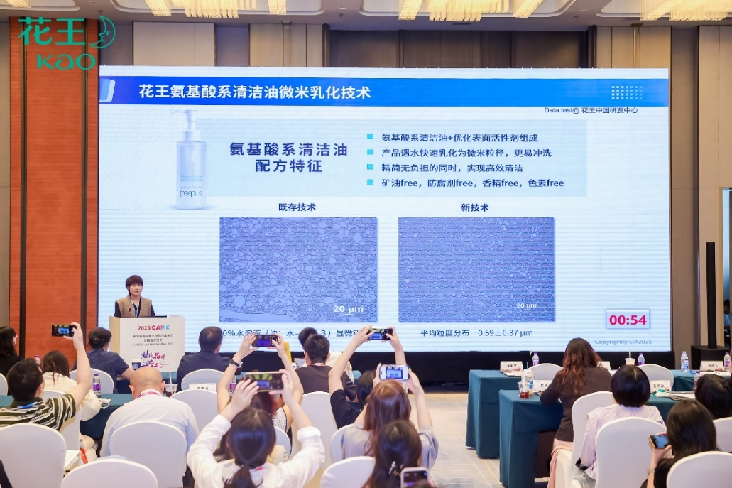 展会同期举办的“循证驱动·医研同行”皮肤科学创新发展研讨会上,花王研发总监刘彦青发表了《氨基酸技术在清洁体系中的创新研究与应用》主题演讲,介绍了芙丽芳丝品牌基于氨基酸技术的洁卸产品创新成果。随着生活者护肤理念的日益成熟,在追求面部洁卸产品清洁力的同时,还需兼顾温和性、皮肤屏障保护及环境友好等需求。对此,花王以“精选成分、配方简约、绿色可持续”为核心开发理念,重点推进氨基酸表面活性剂技术的应用与升级。此次分享重点展示了三项关键技术: